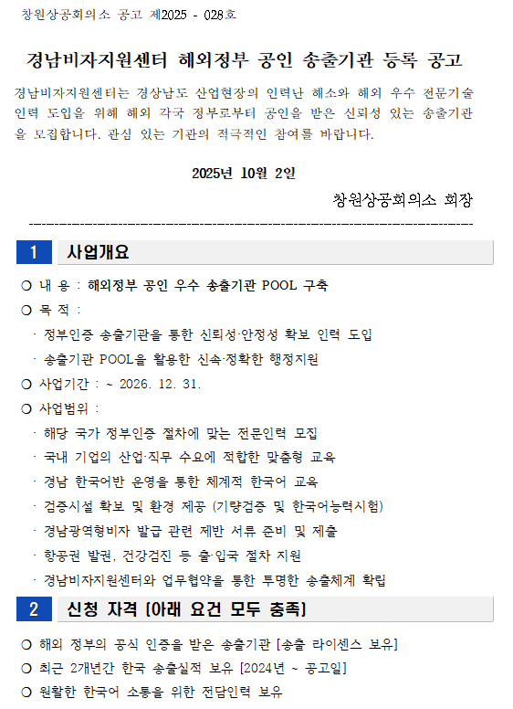 ‒ | 경남비자지원센터 해외정부 공인 송출기관 등록 공고 |