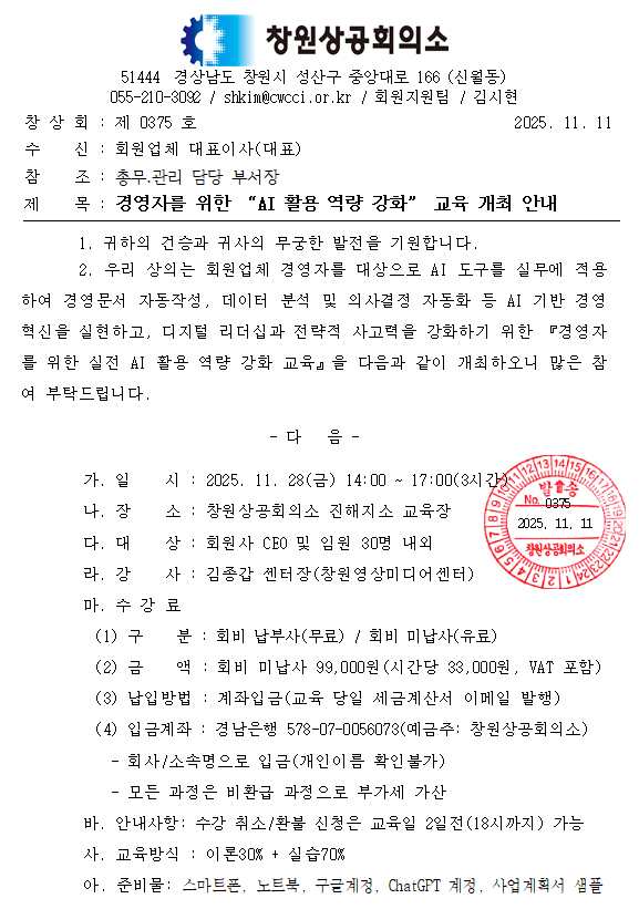 | 제목 | 경영자를 위한 “AI 활용 역량 강화” 교육 개최 안내 | ||