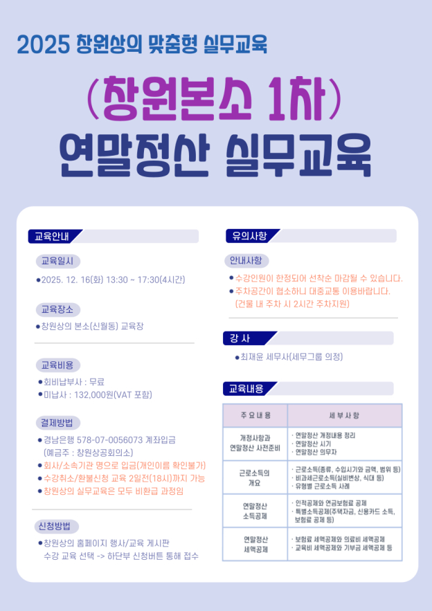 | 제목 | [12/16(화) 실무교육] 연말정산 실무(1차) | ||